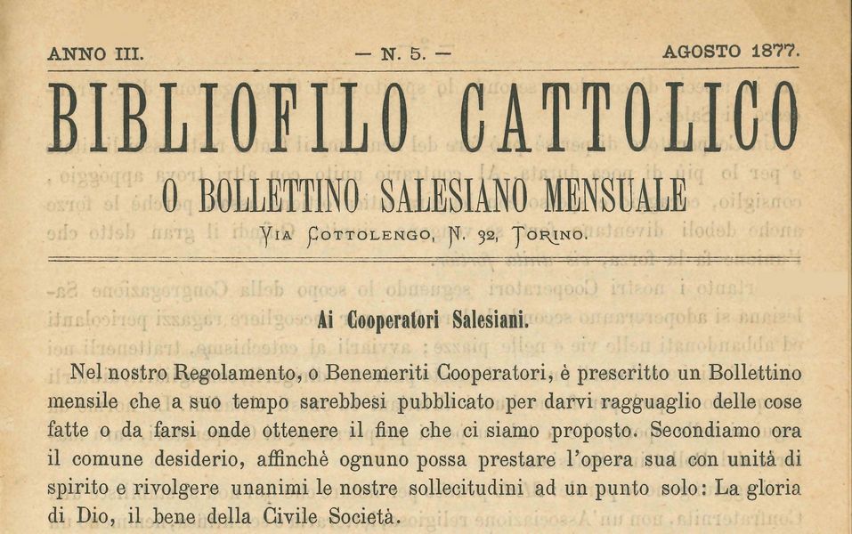 En septiembre/diciembre de 1877 el Boletín Salesiano comenzó a publicarse con el nombre de Bibliofilo cattolico o Bollettino Salesiano mensuale. Il Bibliofilo cattolico era un catálogo cuyo objetivo era dar a conocer las ediciones salesianas y otras publicaciones útiles a la juventud y al clero. En agosto de 1877 sufrió una transformación radical. Llevaba la indicación tipográfica de Sampierdarena para evitar el riesgo de que la curia de Turín le negara el imprimatur. Tenía 12 páginas y los siguientes títulos: Los Cooperadores Salesianos, De los Cooperadores, Cartas de los Misioneros salesianos en la América Meridional, Diversos temas, Primeros ensayos di algunos Cooperadores, Indulgencias especiales en el mes de agosto; seguidas y concluidas por tres densas páginas de un catálogo bibliográfico.