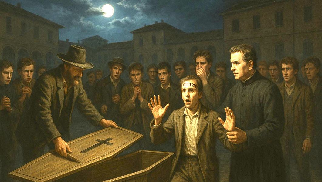 En el sueño que Don Juan Bosco narró a sus jóvenes la noche del 30 de octubre de 1868, el patio del Oratorio de Valdocco se transforma en un sombrío teatro de espera. Al caer el crepúsculo, irrumpen dos sepultureros con un ataúd, lo depositan en el centro, lo abren y, guiados por la luz de la luna, buscan entre los muchachos a quien lleva en la frente la sentencia «Morirás». «Te toca a ti», pronuncian, agarrando al elegido mientras este implora tiempo para arrepentirse. La escena, cargada de tensión, se disuelve en la advertencia de Don Bosco: estar siempre preparados, confesarse, obtener la indulgencia plenaria de Todos los Santos, ya que la muerte llega inesperadamente. Don Gioachino Berto, presente, dejó fiel testimonio de ello. El sueño, acogido con temor y fe, anunció un funeral real pocos meses después.