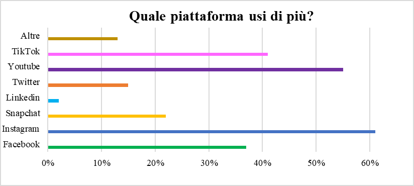 • I giovani preferiscono WhatsApp (64%), Instragram (61%), Youtube (41%), TikTok o Facebook (37%) e Messenger (33%). Questa informazione ci aiuta a migliorare le nostre modalità di comunicazione con loro perché gli adulti potrebbero sforzarsi di più per essere presenti in piattaforme dove i giovani non ci sono. Forse i migliori canali di comunicazione potrebbero essere Facebook per i genitori e Instagram per i nostri giovani.